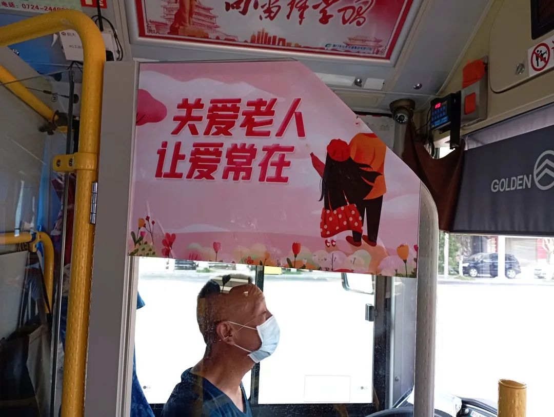 作為公司首條公交“敬老示范線”,1路車輛上的許多細節(jié),都體現(xiàn)著對老年人的關(guān)懷。車廂內(nèi),駕駛室門、座位間靠背都貼有尊老敬老的標(biāo)語,宣傳敬老文明思想,營造和諧溫馨氛。