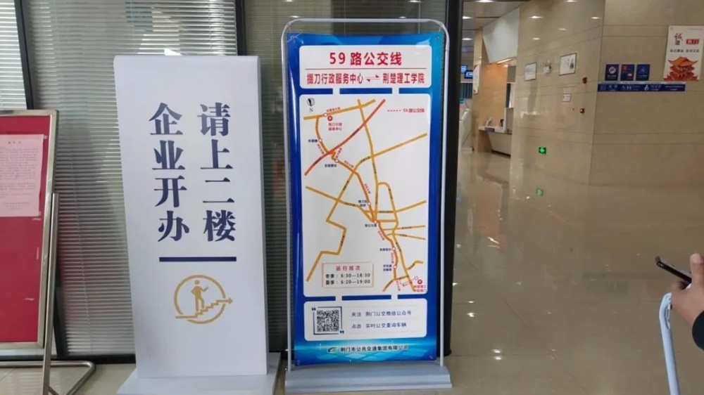 荊門高新區(qū)·掇刀區(qū)政務(wù)服務(wù)中心大廳內(nèi)59路車走向信息展牌引導(dǎo)乘車