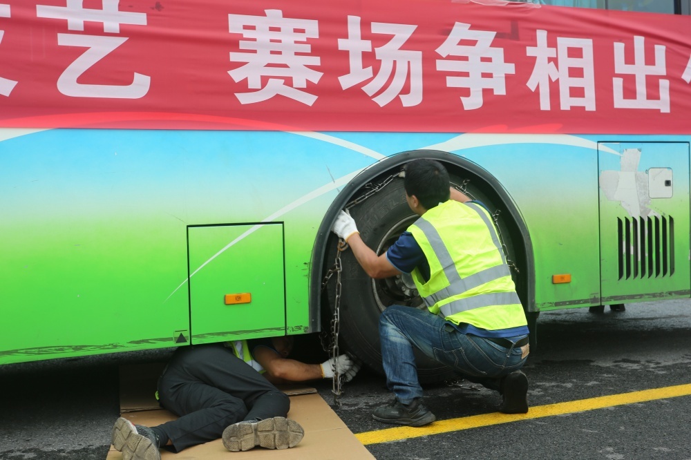 在安裝防滑鏈項(xiàng)目比武現(xiàn)場(chǎng),市公交集團(tuán)汽修公司員工王剛、劉小備兩人準(zhǔn)備充分、配合默契——先由一人進(jìn)入車底檢查車況,一人拿出防滑鏈等待安裝。很快,車況檢查結(jié)束,兩人迅速將防滑鏈套上輪胎,并將防滑鏈上的橡皮繩捆扎成規(guī)則五角形,經(jīng)檢查內(nèi)外側(cè)松度并無明顯松垮現(xiàn)象后,以3分09秒的成績結(jié)束比賽。